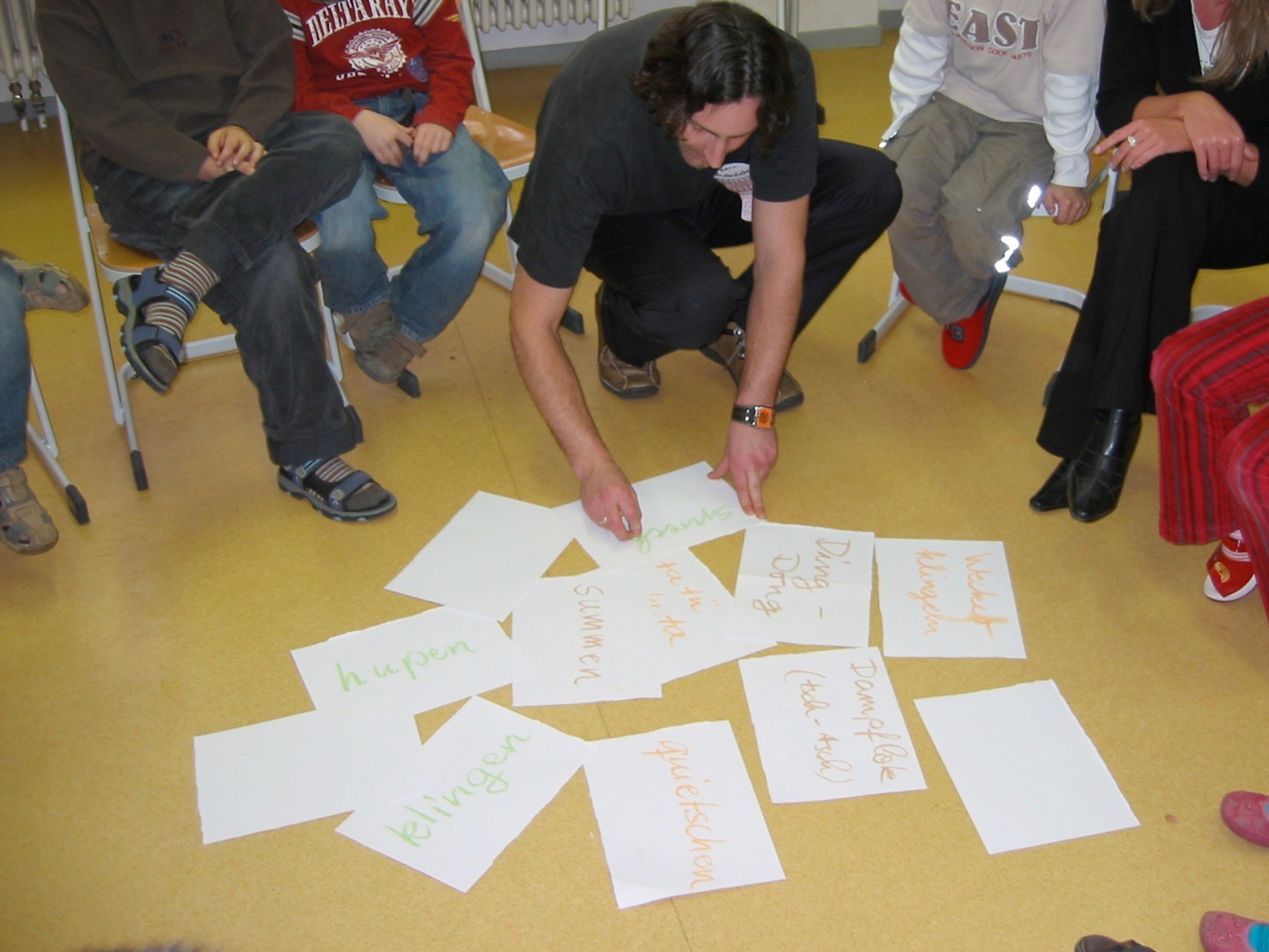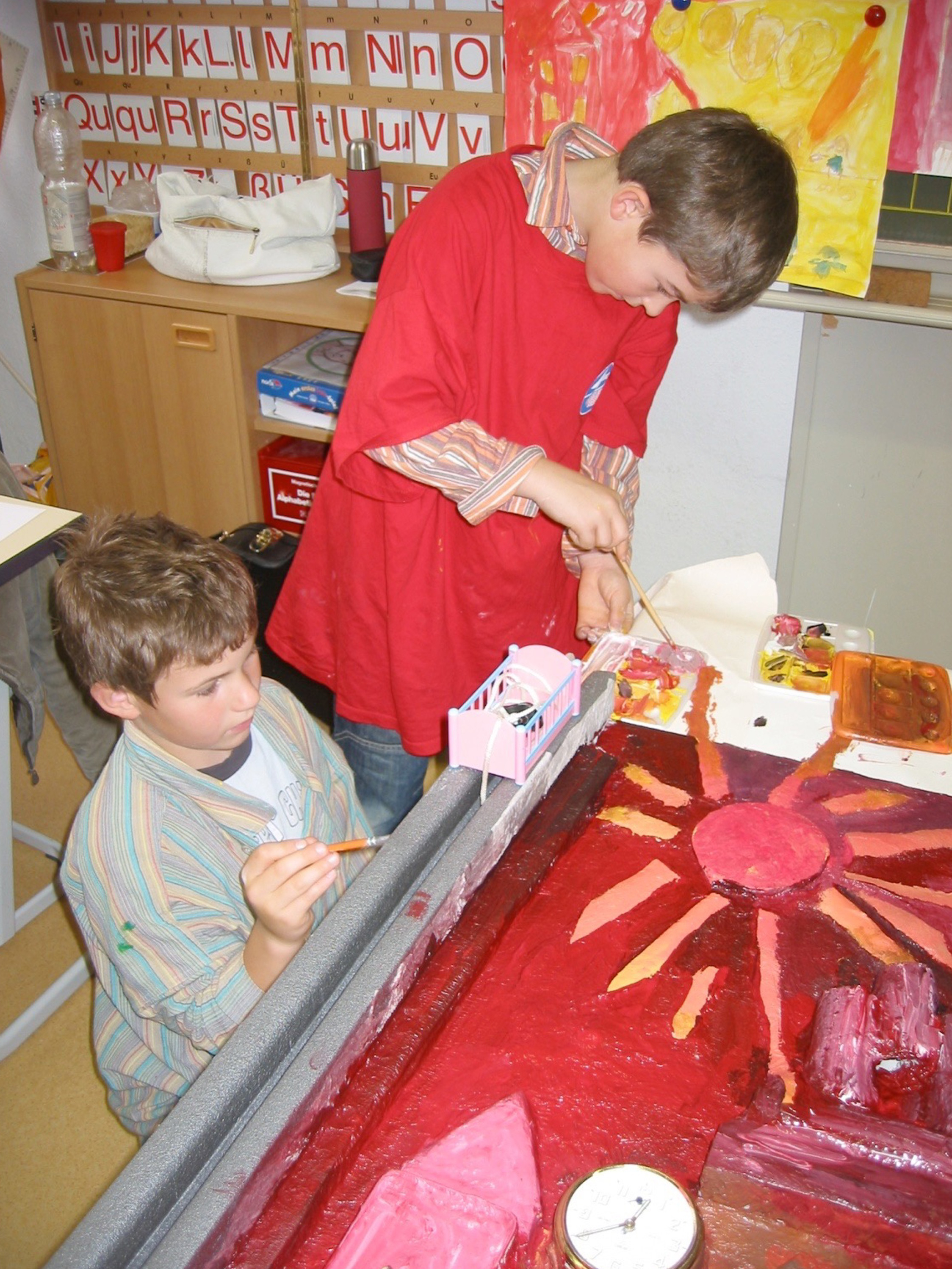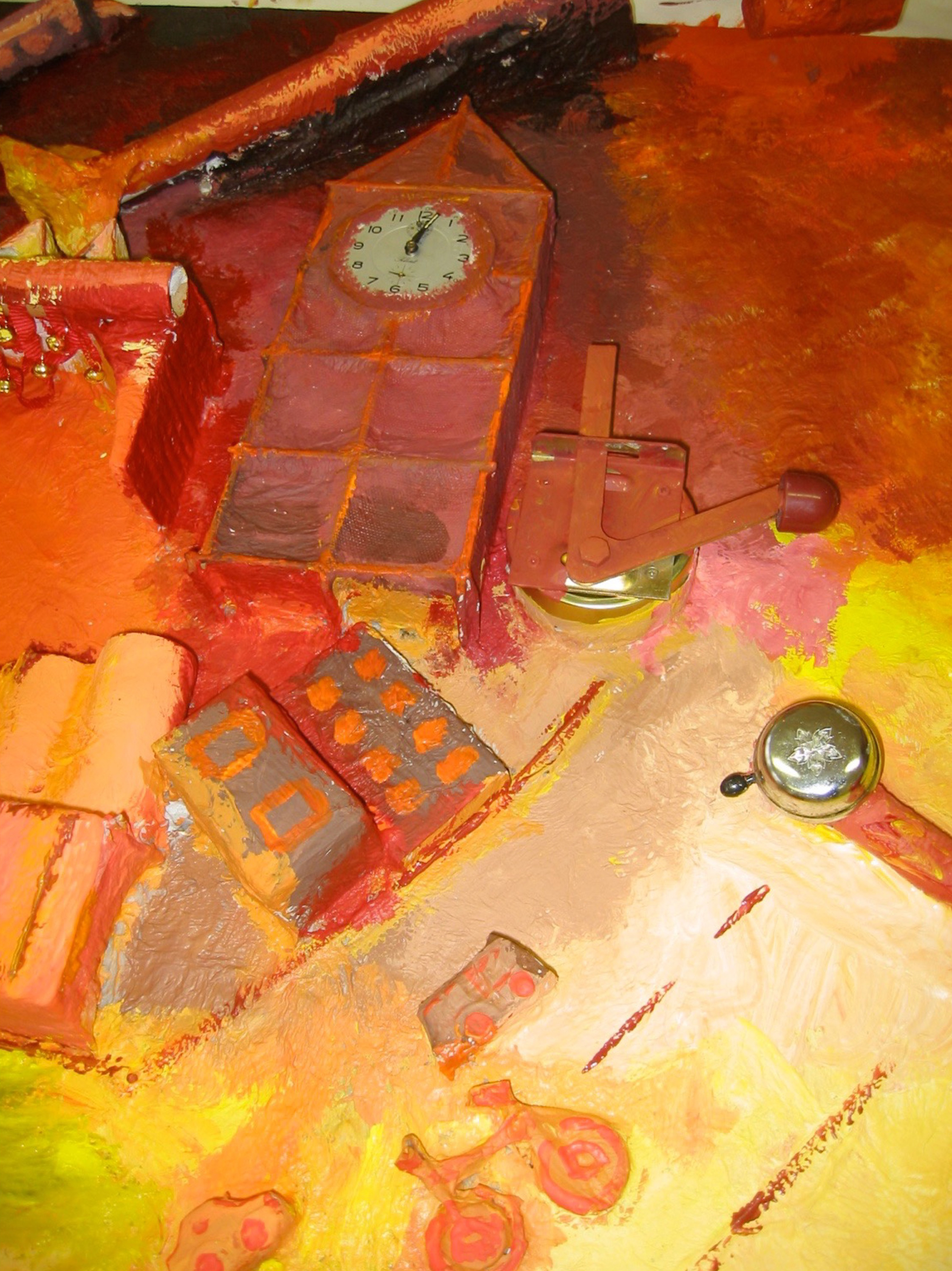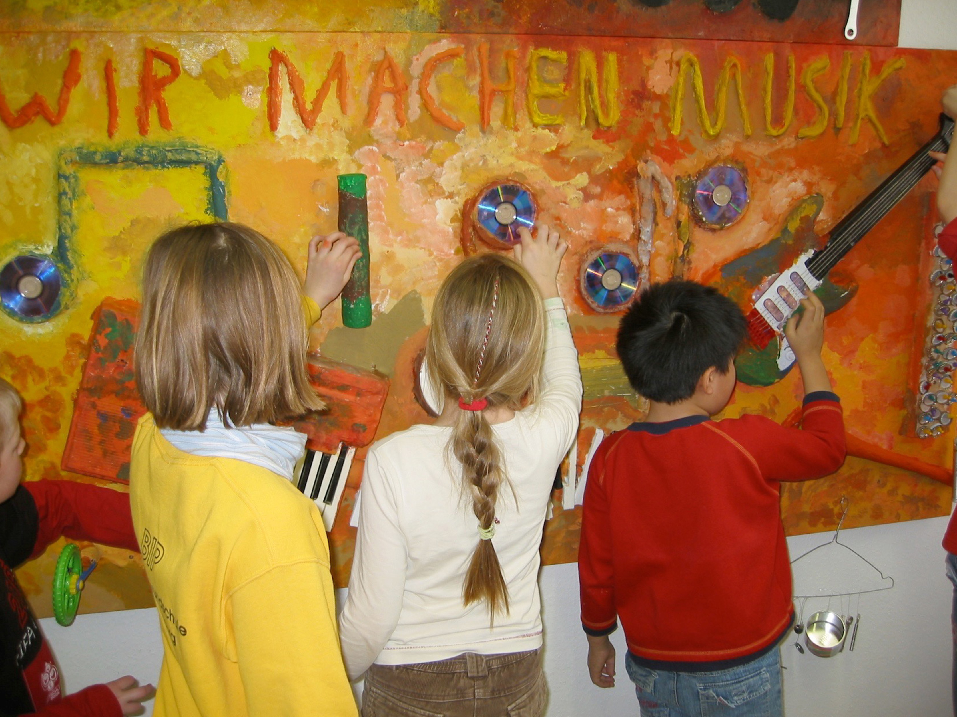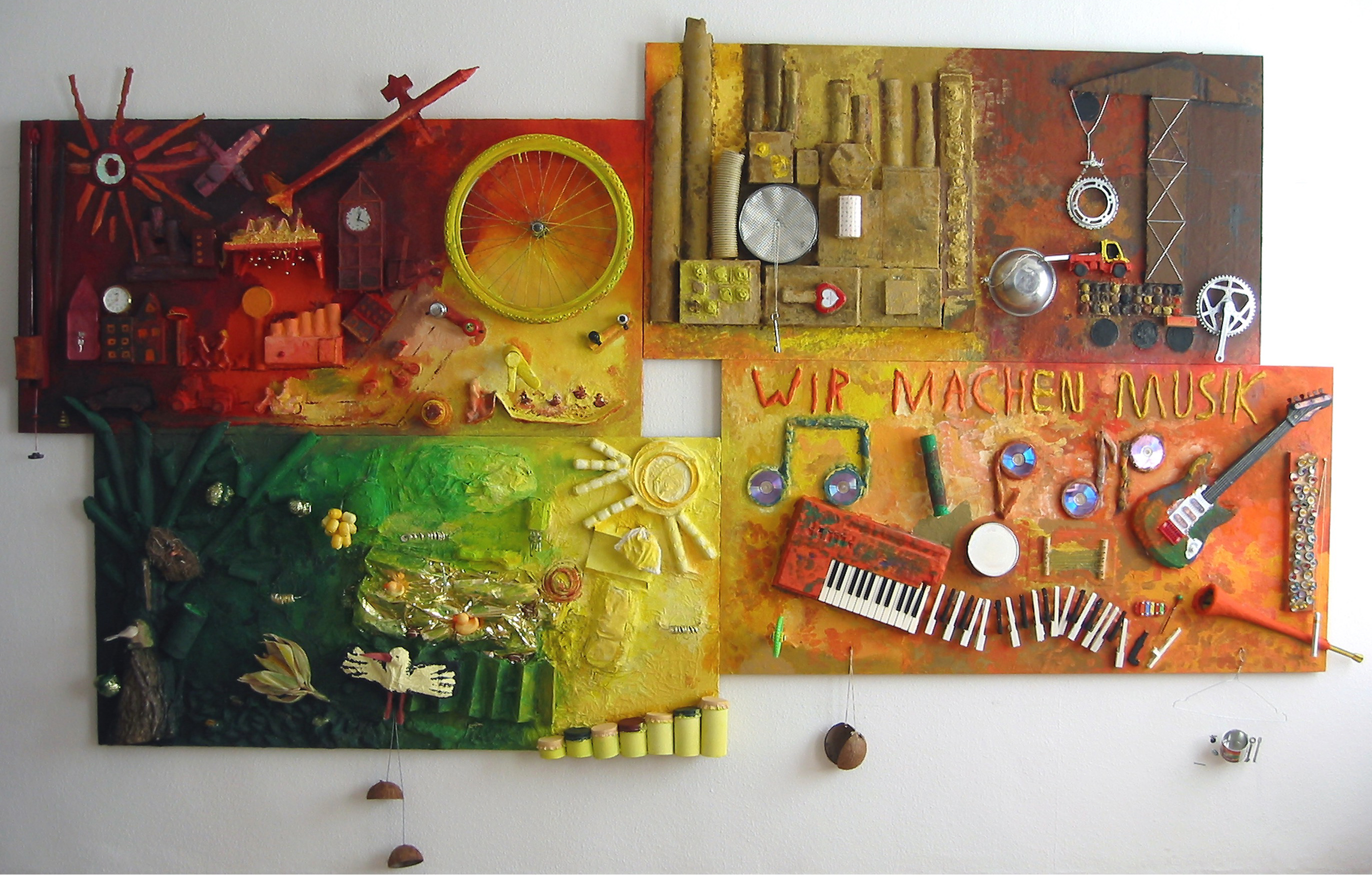 Vor Projektbeginn wurden dieses Thema im Brainstorming mit den Schülerinnen und Schülern aufgegliedert mit Bezug auf die Stadt, die Industrie, die Natur und die Musik. Eine ganze Woche lang haben sie dann verschiedene Klangwelten bildnerisch, z. T. sogar akustisch entstehen lassen: Klänge in ihrer Stadt, Klänge in der Industrie, Klänge in der Natur und Klänge in der Welt der Musik. Im Ergebnis entstanden vier Materialbilder, die zu einem Gesamtbild zusammengefügt wurden. Es ist gestaltet mit vielen gemalten Form- und Farbklängen, aber auch aus vielen realen Objekten, mit denen sich z. T. sogar Klänge erzeugen lassen. Mit den Schülerinnen und Schülern wurden vorab auch die Grundfarbigkeiten der vier Bildzonen erarbeitet: Rot-Gelb-Töne für die Stadt, Rosttöne für die Industrie, Gelb-Grün-Töne für die Natur, Gelb-Orange-Töne für die Musik. Dabei ging es auch um die Sicherung von gestalterischer Einheit, um die vielen Details bzw. Einzelelemente im Ganzen ›aufzufangen‹ Eine besondere Herausforderung in der Startphase bestand in Folgendem: Der Prozess musste so offen und zugleich strukturiert in Gang gesetzt werden, damit die Kinder von Anfang mit den vorhandenen Materialien, Objekten und Objektteilen experimentell umgehen und ausprobieren konnten, wie sie sich in ein neues Ganzes einbinden lassen und gegebenenfalls auch umfunktionieren lassen. Eine besondere Schwierigkeit lag darin, die Darstellungsgegenstände nicht zu malen, sondern reliefartig aus vorhandenen Gegenständen zu bilden. Nicht zuletzt galt es, in Gruppenarbeit das große Format der vier Hartfaserplatten von je 1 x 2 m als Bildträger zu bewältigen.« (Steffen Wachter)