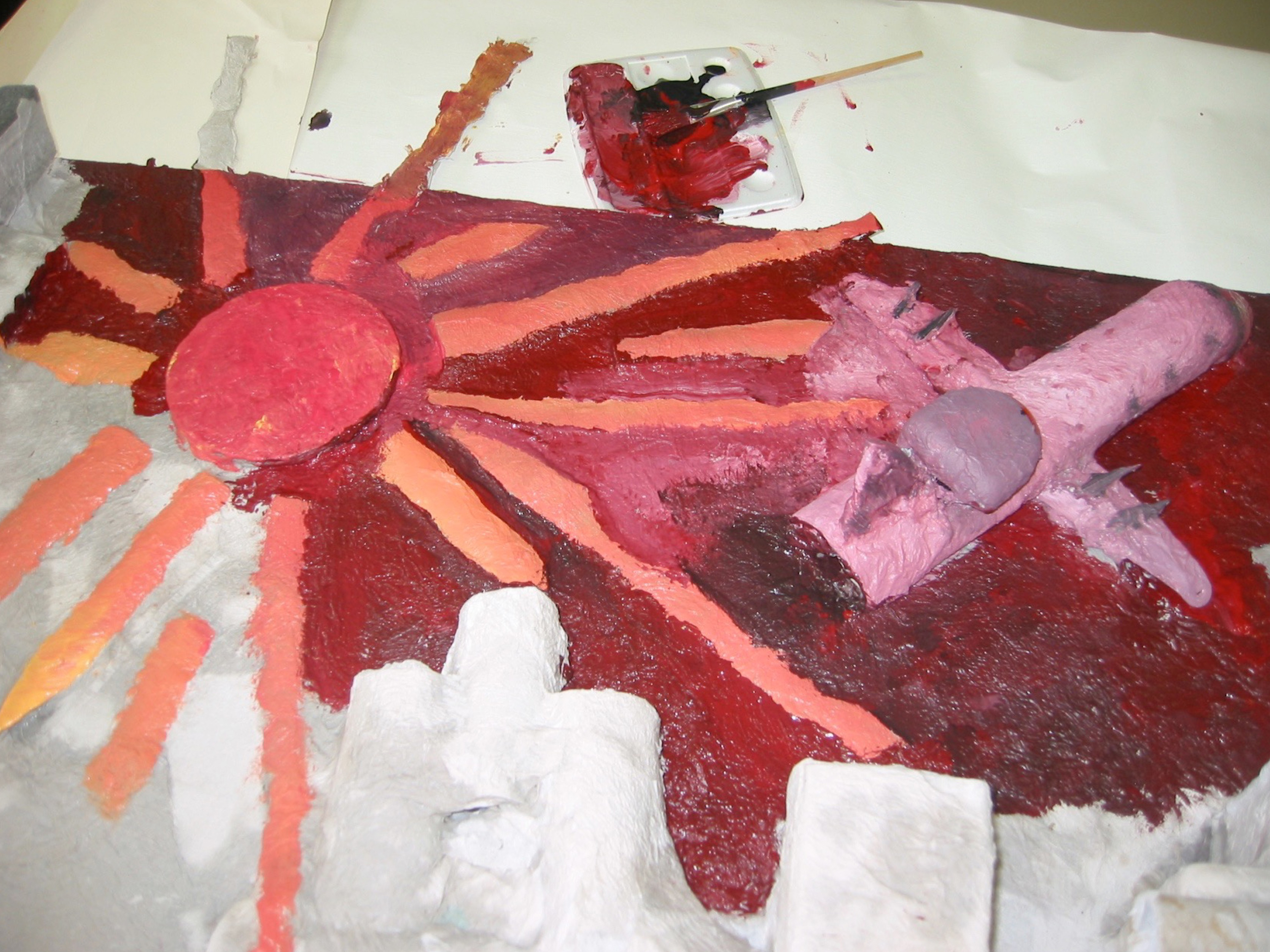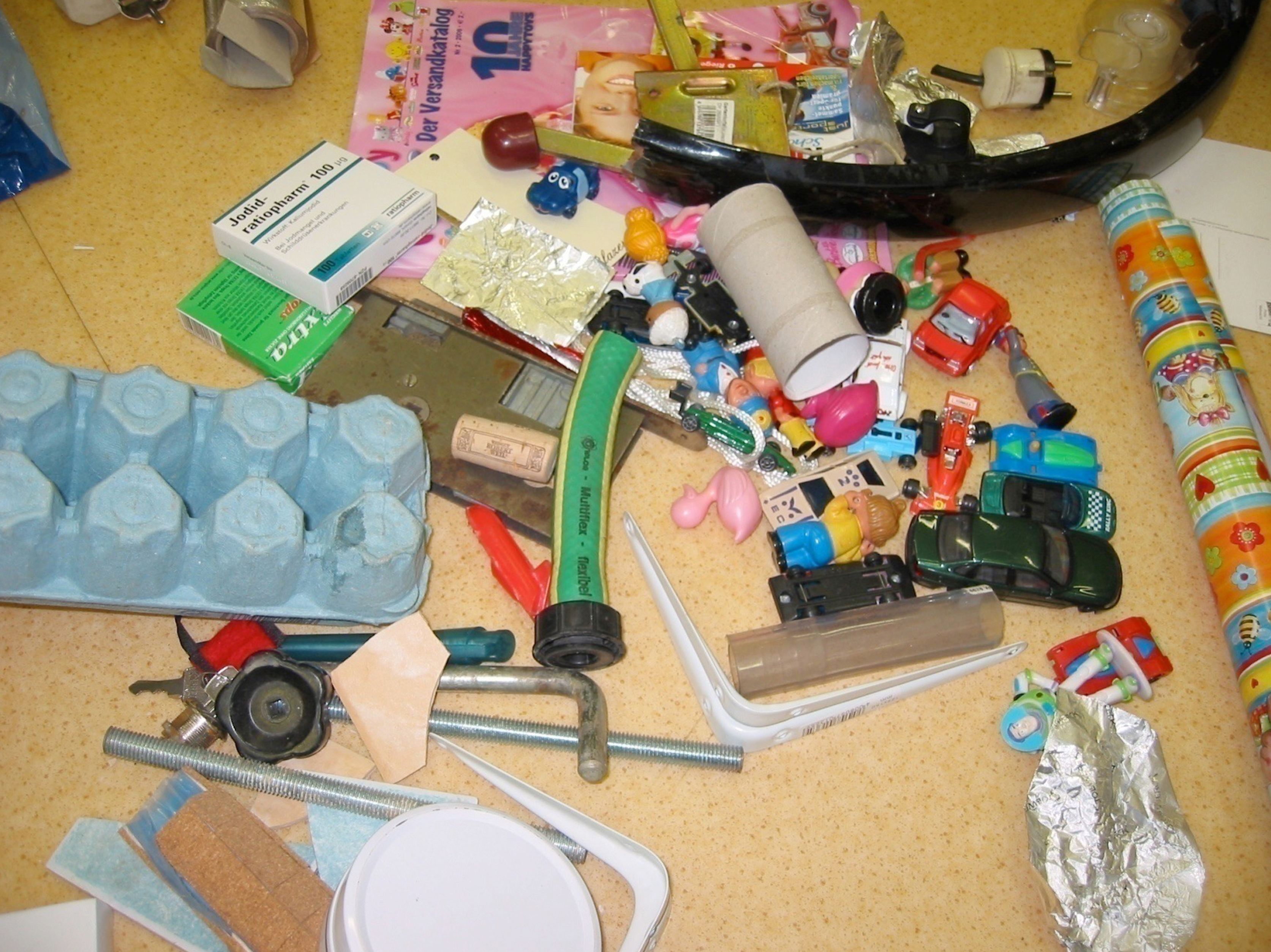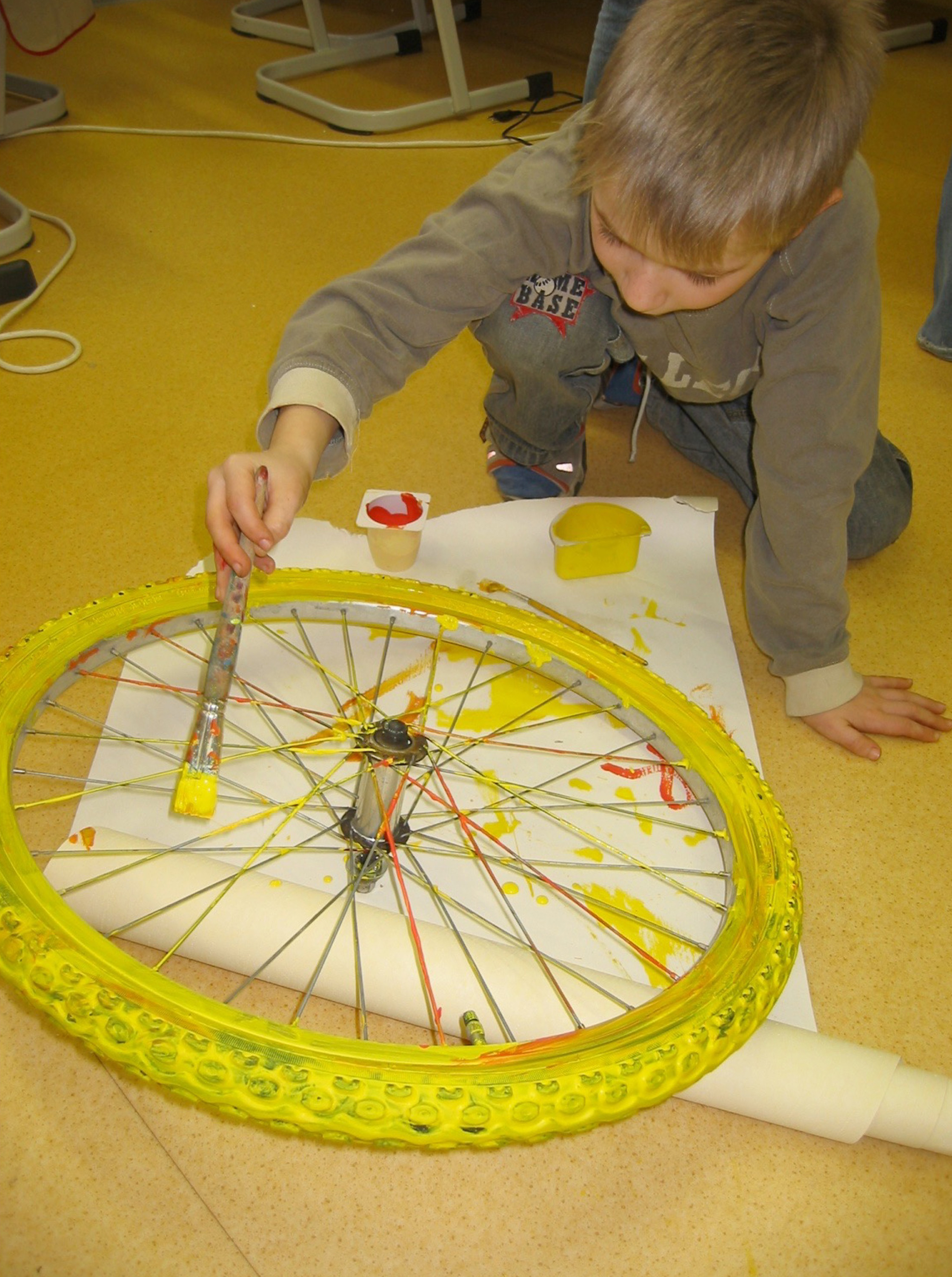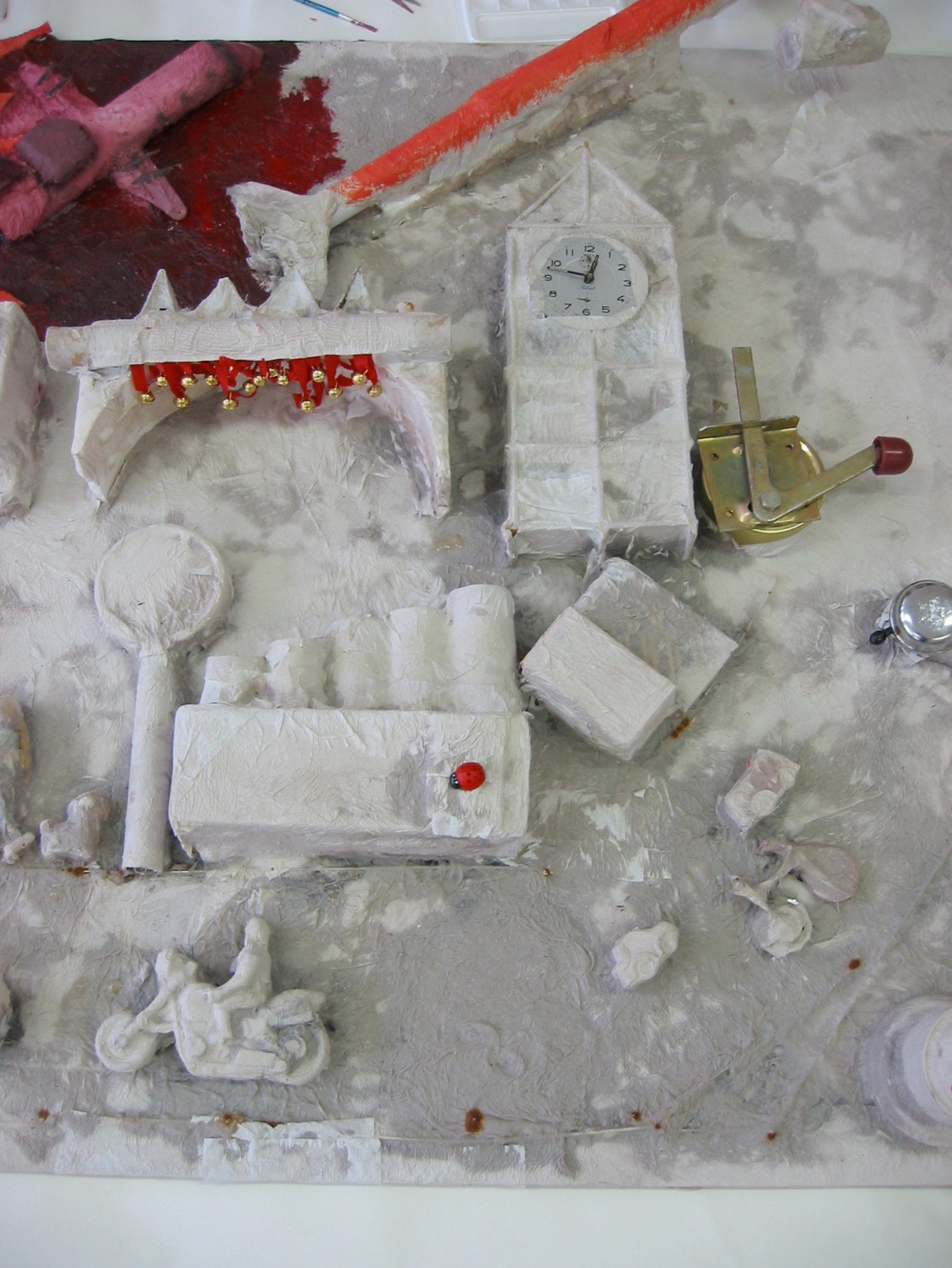 Vor Projektbeginn wurden dieses Thema im Brainstorming mit den Schülerinnen und Schülern aufgegliedert mit Bezug auf die Stadt, die Industrie, die Natur und die Musik. Eine ganze Woche lang haben sie dann verschiedene Klangwelten bildnerisch, z. T. sogar akustisch entstehen lassen: Klänge in ihrer Stadt, Klänge in der Industrie, Klänge in der Natur und Klänge in der Welt der Musik. Im Ergebnis entstanden vier Materialbilder, die zu einem Gesamtbild zusammengefügt wurden. Es ist gestaltet mit vielen gemalten Form- und Farbklängen, aber auch aus vielen realen Objekten, mit denen sich z. T. sogar Klänge erzeugen lassen. Mit den Schülerinnen und Schülern wurden vorab auch die Grundfarbigkeiten der vier Bildzonen erarbeitet: Rot-Gelb-Töne für die Stadt, Rosttöne für die Industrie, Gelb-Grün-Töne für die Natur, Gelb-Orange-Töne für die Musik. Dabei ging es auch um die Sicherung von gestalterischer Einheit, um die vielen Details bzw. Einzelelemente im Ganzen ›aufzufangen‹ Eine besondere Herausforderung in der Startphase bestand in Folgendem: Der Prozess musste so offen und zugleich strukturiert in Gang gesetzt werden, damit die Kinder von Anfang mit den vorhandenen Materialien, Objekten und Objektteilen experimentell umgehen und ausprobieren konnten, wie sie sich in ein neues Ganzes einbinden lassen und gegebenenfalls auch umfunktionieren lassen. Eine besondere Schwierigkeit lag darin, die Darstellungsgegenstände nicht zu malen, sondern reliefartig aus vorhandenen Gegenständen zu bilden. Nicht zuletzt galt es, in Gruppenarbeit das große Format der vier Hartfaserplatten von je 1 x 2 m als Bildträger zu bewältigen.« (Steffen Wachter)