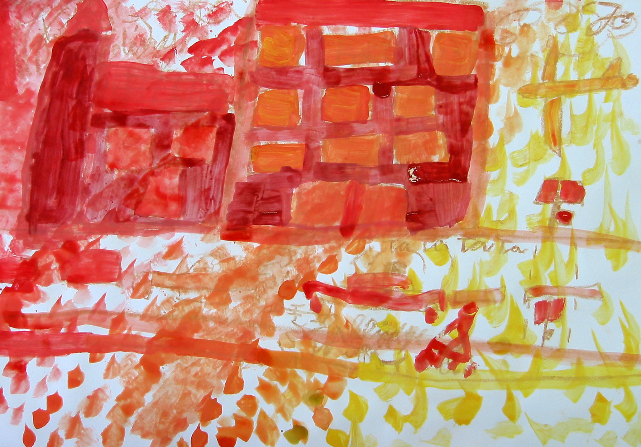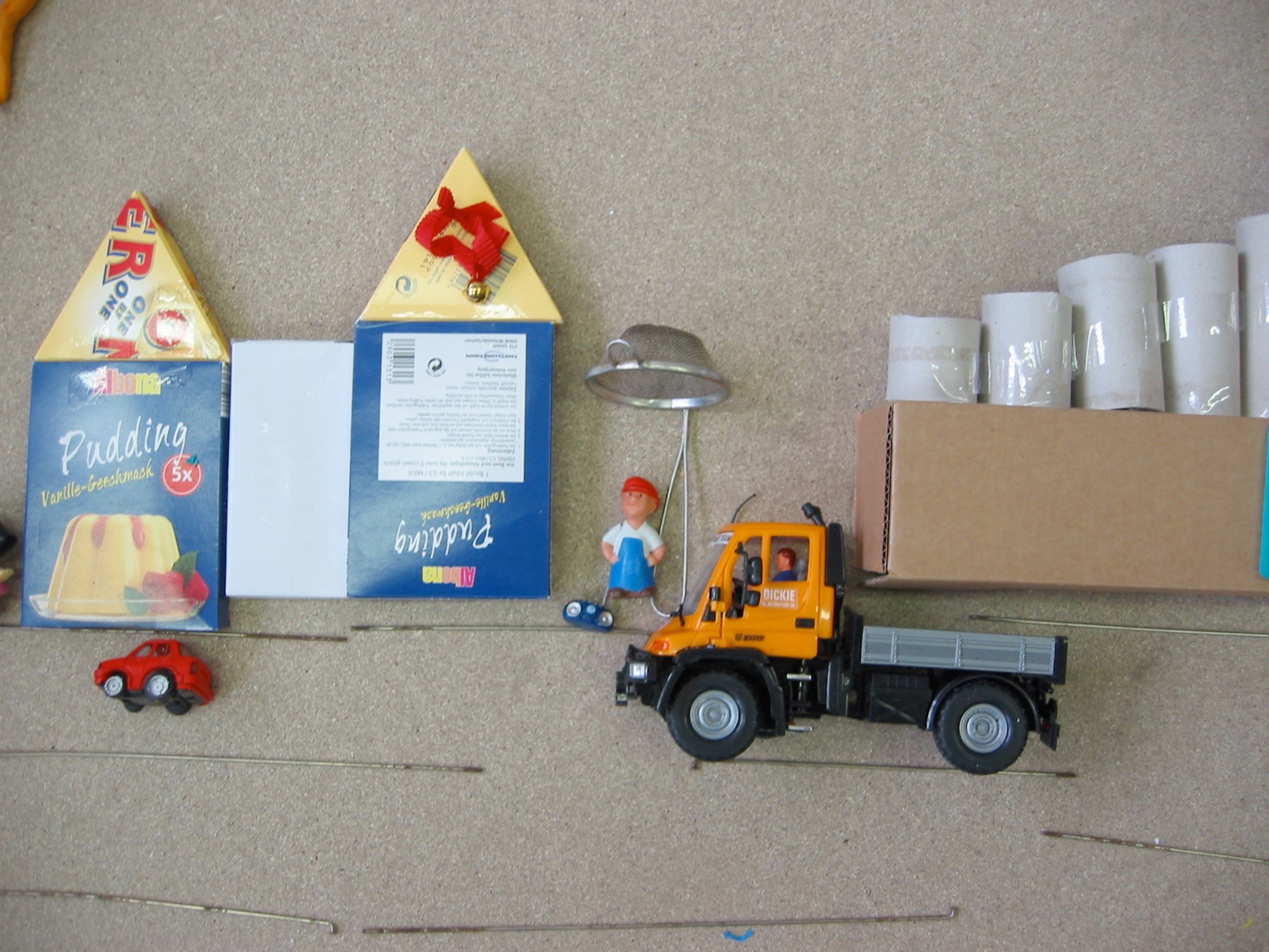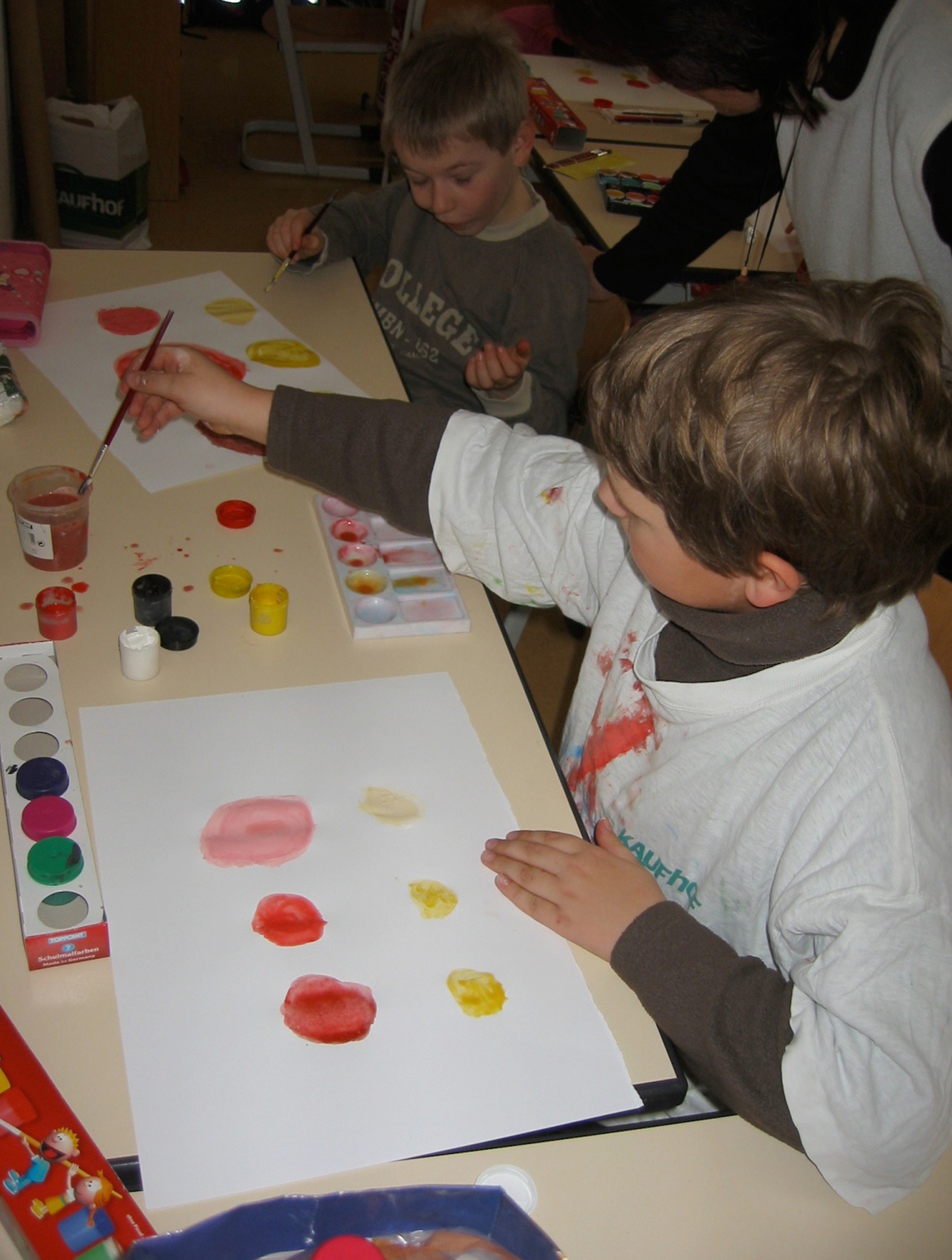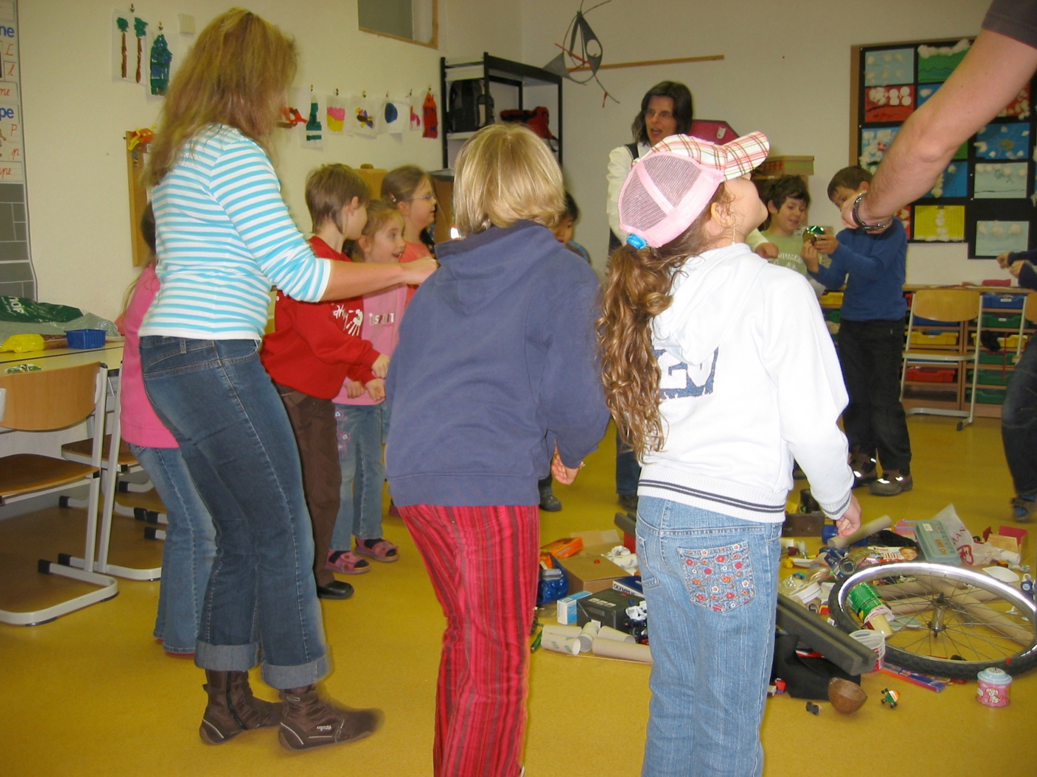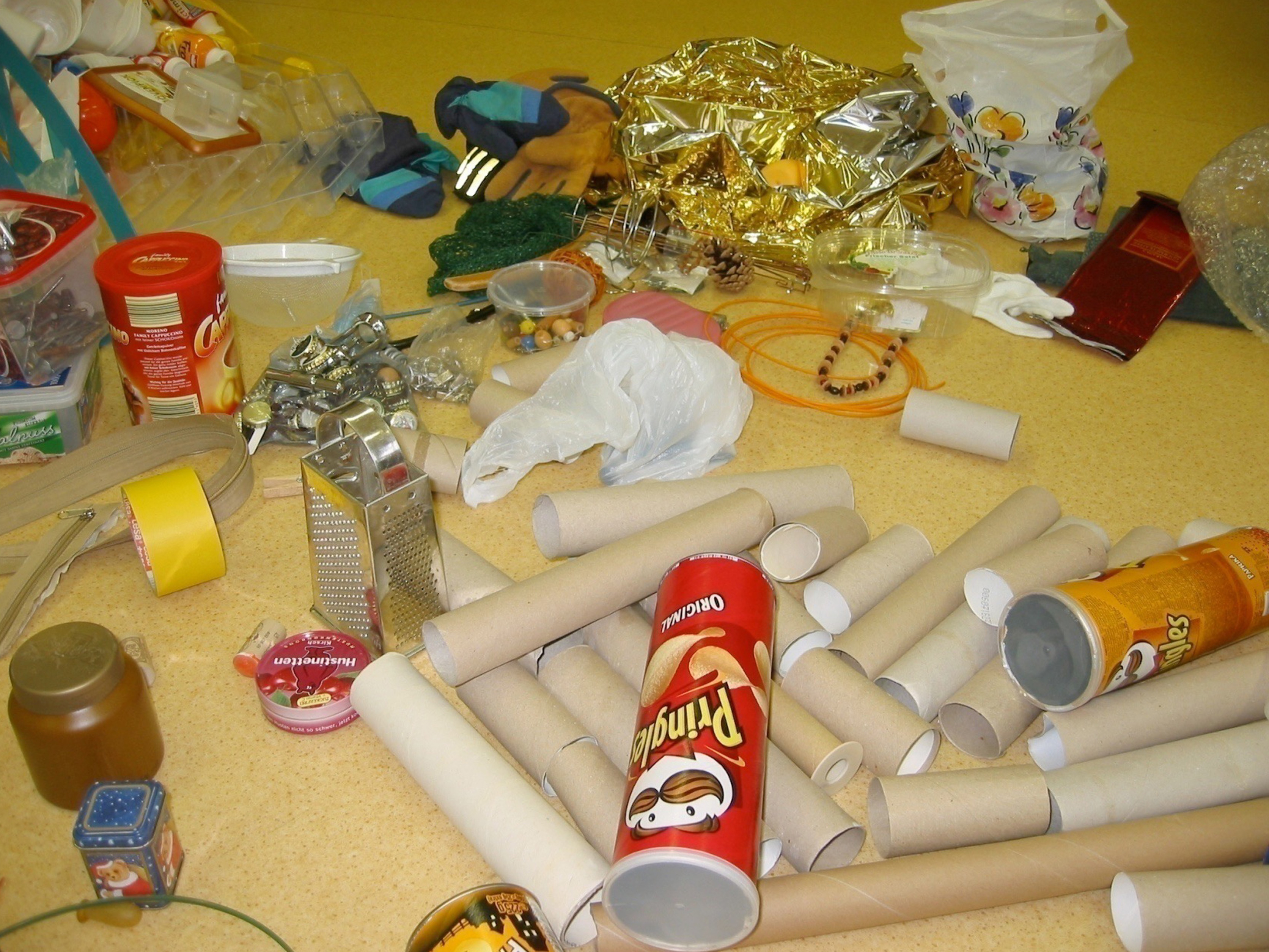 Vor Projektbeginn wurden dieses Thema im Brainstorming mit den Schülerinnen und Schülern aufgegliedert mit Bezug auf die Stadt, die Industrie, die Natur und die Musik. Eine ganze Woche lang haben sie dann verschiedene Klangwelten bildnerisch, z. T. sogar akustisch entstehen lassen: Klänge in ihrer Stadt, Klänge in der Industrie, Klänge in der Natur und Klänge in der Welt der Musik. Im Ergebnis entstanden vier Materialbilder, die zu einem Gesamtbild zusammengefügt wurden. Es ist gestaltet mit vielen gemalten Form- und Farbklängen, aber auch aus vielen realen Objekten, mit denen sich z. T. sogar Klänge erzeugen lassen. Mit den Schülerinnen und Schülern wurden vorab auch die Grundfarbigkeiten der vier Bildzonen erarbeitet: Rot-Gelb-Töne für die Stadt, Rosttöne für die Industrie, Gelb-Grün-Töne für die Natur, Gelb-Orange-Töne für die Musik. Dabei ging es auch um die Sicherung von gestalterischer Einheit, um die vielen Details bzw. Einzelelemente im Ganzen ›aufzufangen‹ Eine besondere Herausforderung in der Startphase bestand in Folgendem: Der Prozess musste so offen und zugleich strukturiert in Gang gesetzt werden, damit die Kinder von Anfang mit den vorhandenen Materialien, Objekten und Objektteilen experimentell umgehen und ausprobieren konnten, wie sie sich in ein neues Ganzes einbinden lassen und gegebenenfalls auch umfunktionieren lassen. Eine besondere Schwierigkeit lag darin, die Darstellungsgegenstände nicht zu malen, sondern reliefartig aus vorhandenen Gegenständen zu bilden. Nicht zuletzt galt es, in Gruppenarbeit das große Format der vier Hartfaserplatten von je 1 x 2 m als Bildträger zu bewältigen.« (Steffen Wachter)