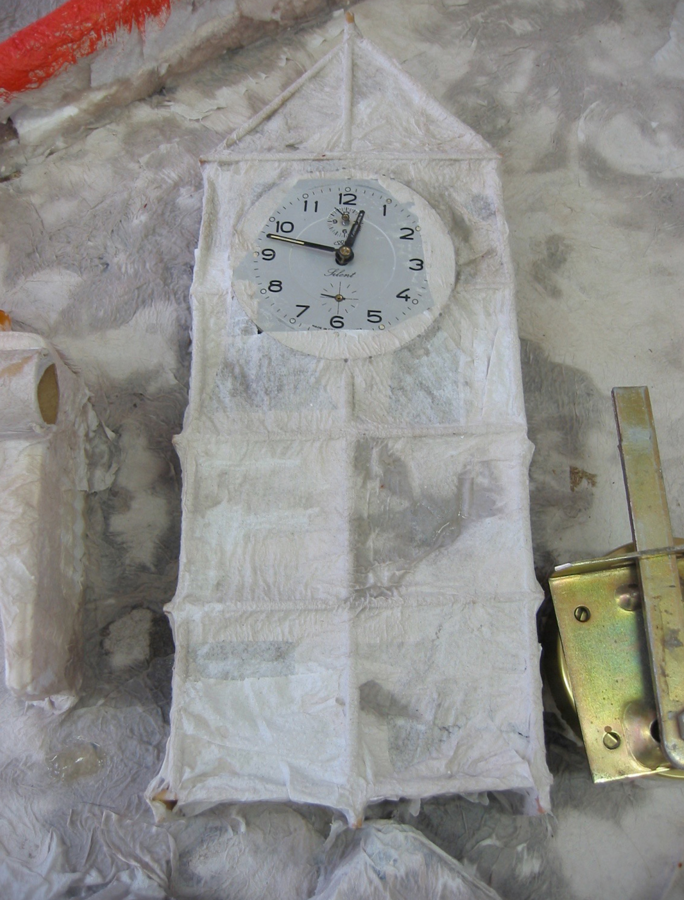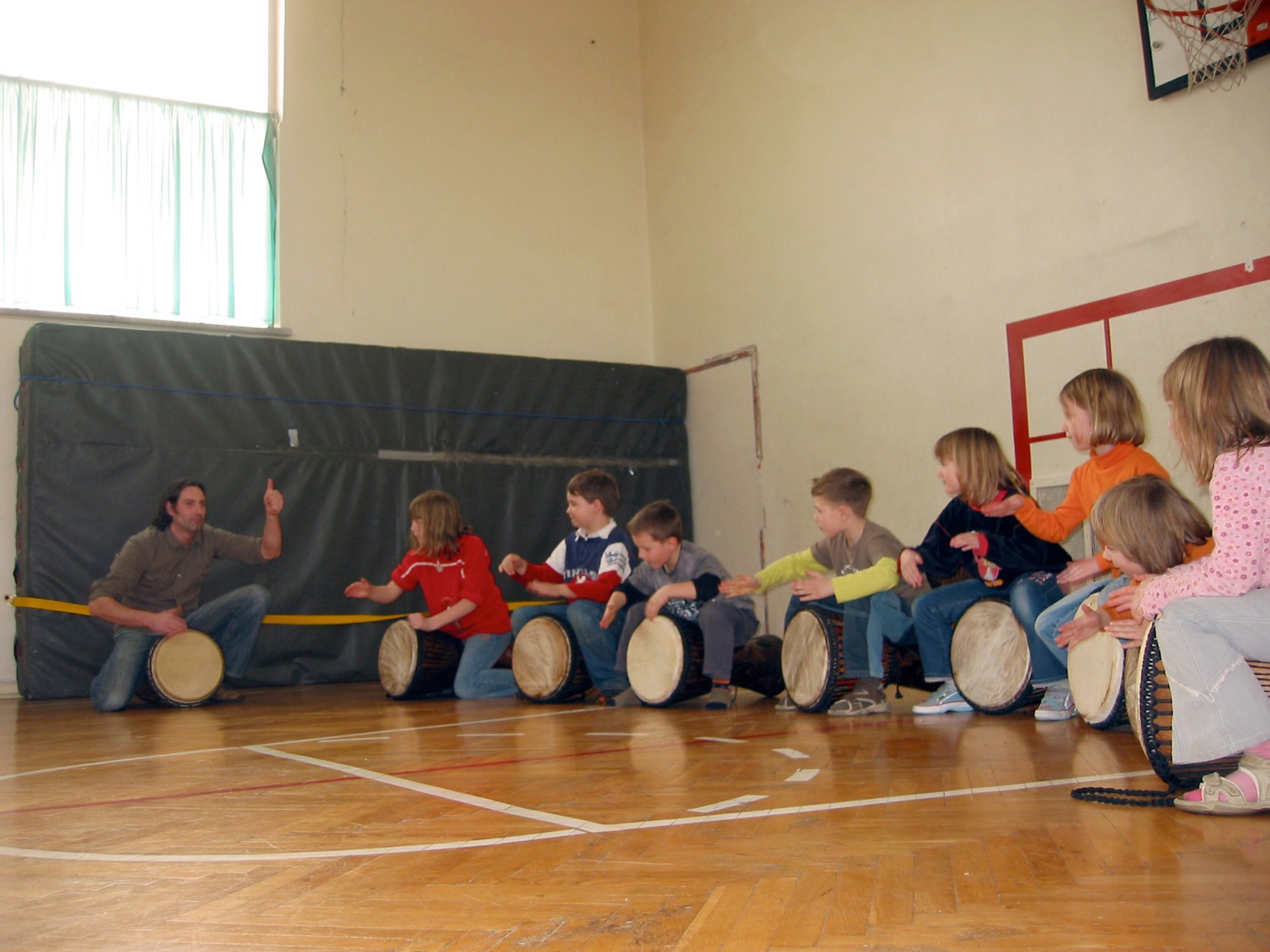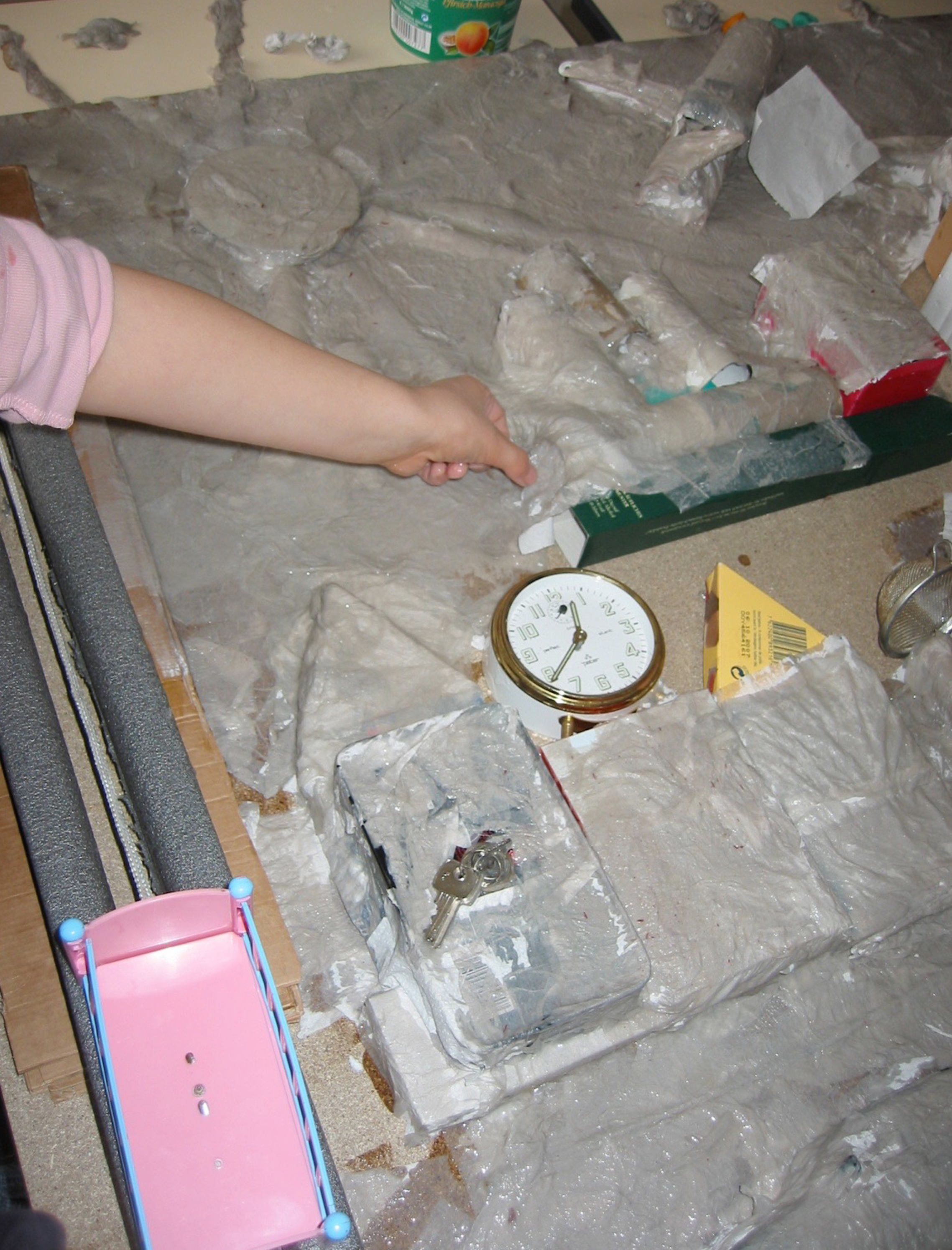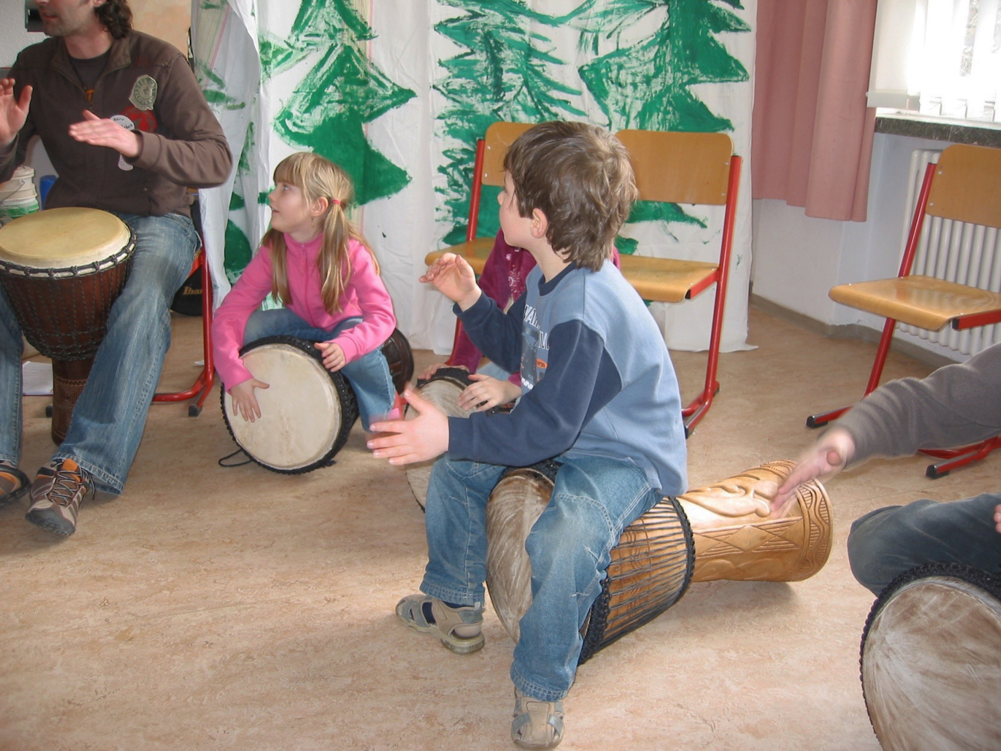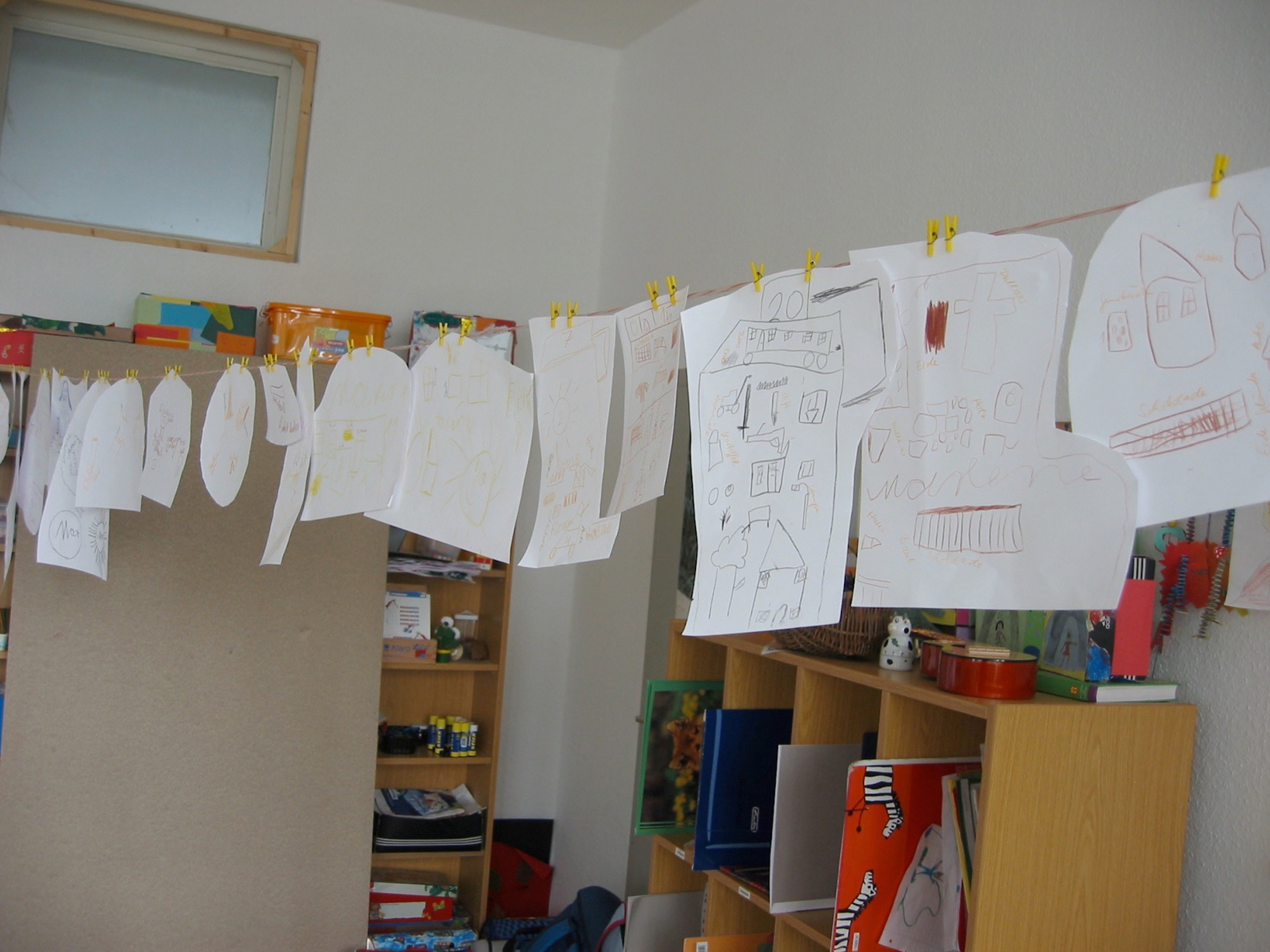 Vor Projektbeginn wurden dieses Thema im Brainstorming mit den Schülerinnen und Schülern aufgegliedert mit Bezug auf die Stadt, die Industrie, die Natur und die Musik. Eine ganze Woche lang haben sie dann verschiedene Klangwelten bildnerisch, z. T. sogar akustisch entstehen lassen: Klänge in ihrer Stadt, Klänge in der Industrie, Klänge in der Natur und Klänge in der Welt der Musik. Im Ergebnis entstanden vier Materialbilder, die zu einem Gesamtbild zusammengefügt wurden. Es ist gestaltet mit vielen gemalten Form- und Farbklängen, aber auch aus vielen realen Objekten, mit denen sich z. T. sogar Klänge erzeugen lassen. Mit den Schülerinnen und Schülern wurden vorab auch die Grundfarbigkeiten der vier Bildzonen erarbeitet: Rot-Gelb-Töne für die Stadt, Rosttöne für die Industrie, Gelb-Grün-Töne für die Natur, Gelb-Orange-Töne für die Musik. Dabei ging es auch um die Sicherung von gestalterischer Einheit, um die vielen Details bzw. Einzelelemente im Ganzen ›aufzufangen‹ Eine besondere Herausforderung in der Startphase bestand in Folgendem: Der Prozess musste so offen und zugleich strukturiert in Gang gesetzt werden, damit die Kinder von Anfang mit den vorhandenen Materialien, Objekten und Objektteilen experimentell umgehen und ausprobieren konnten, wie sie sich in ein neues Ganzes einbinden lassen und gegebenenfalls auch umfunktionieren lassen. Eine besondere Schwierigkeit lag darin, die Darstellungsgegenstände nicht zu malen, sondern reliefartig aus vorhandenen Gegenständen zu bilden. Nicht zuletzt galt es, in Gruppenarbeit das große Format der vier Hartfaserplatten von je 1 x 2 m als Bildträger zu bewältigen.« (Steffen Wachter)